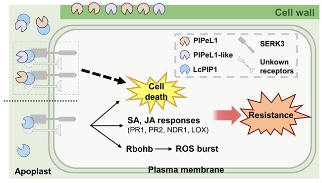 PlPeL1或PlPeL1-like和LcPIP1在植物免疫中的互作模式图。受访者供图